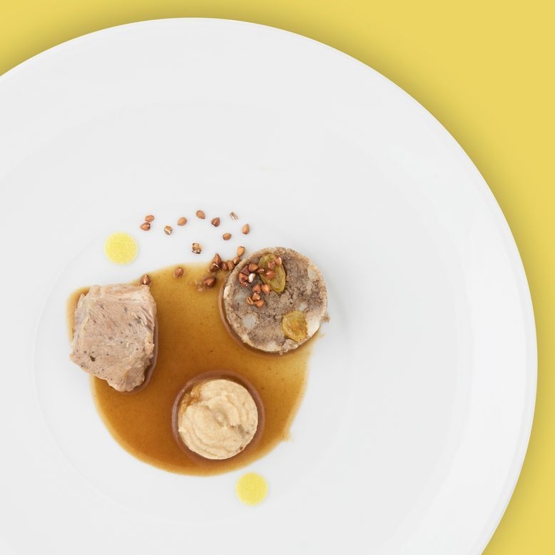 ・子羊の肩肉のコンフィ、根セロリのピュレ、ひき割りそば粉添え クリーミーな帆立貝のフラン、2種のキノコ添え