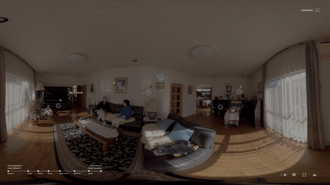 「TRUE MEMORY」は、終活×デジタル「さようならの贈り物。」をテーマに開発した、インタラクションが可能な360度動画を活用した空間記録サービスです。部屋にある思い出の深いものを、動画、音声、写真で記録しデータ化、それらをVR空間の中に格納することで、ただ360度映像を見るのではなく、クリックすればタンスの中のお母さんの料理レシピや、お父さんが集めた蔵書が見られたり、趣味の音楽が聴けるようにし、まるで家一軒を丸々手元に収めておけるような体験を可能にします。本ブースでは、実際に本サービスを受けてもいいという方にご協力をいただいた「本当の家族の記憶を収めたドキュメンタリーフィルム」をお楽しみいただけます。