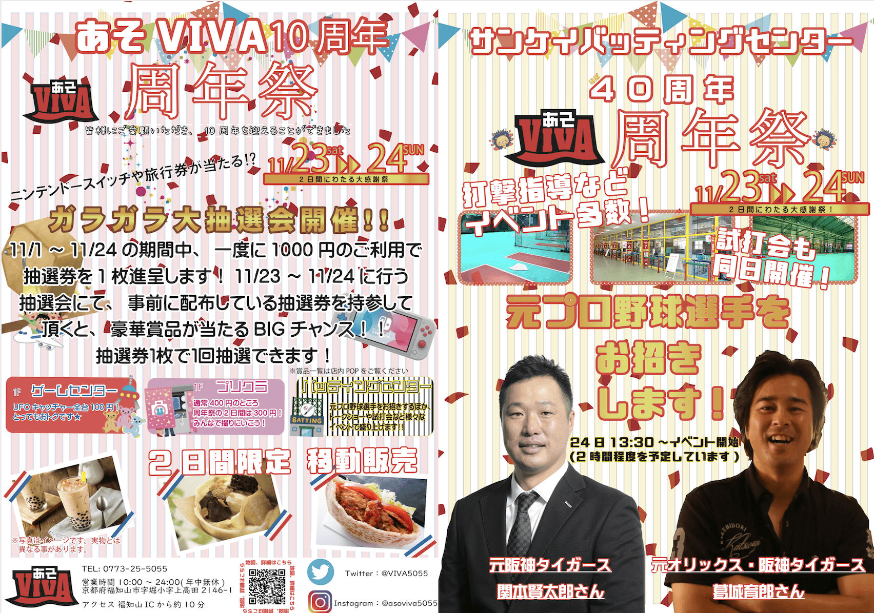 三恵観光株式会社(本社:京都府福知山市、代表取締役:杉本 潤明)が運営するゲームセンター「あそVIVA(あそびば)本店」と、併設しているバッティングセンター「サンケイバッティングセンター」にて、2019年11月23日(土)・24日(日)、あそVIVA10周年&サンケイバッティングセンター40周年 周年祭(以下、本イベント)を開催いたします。