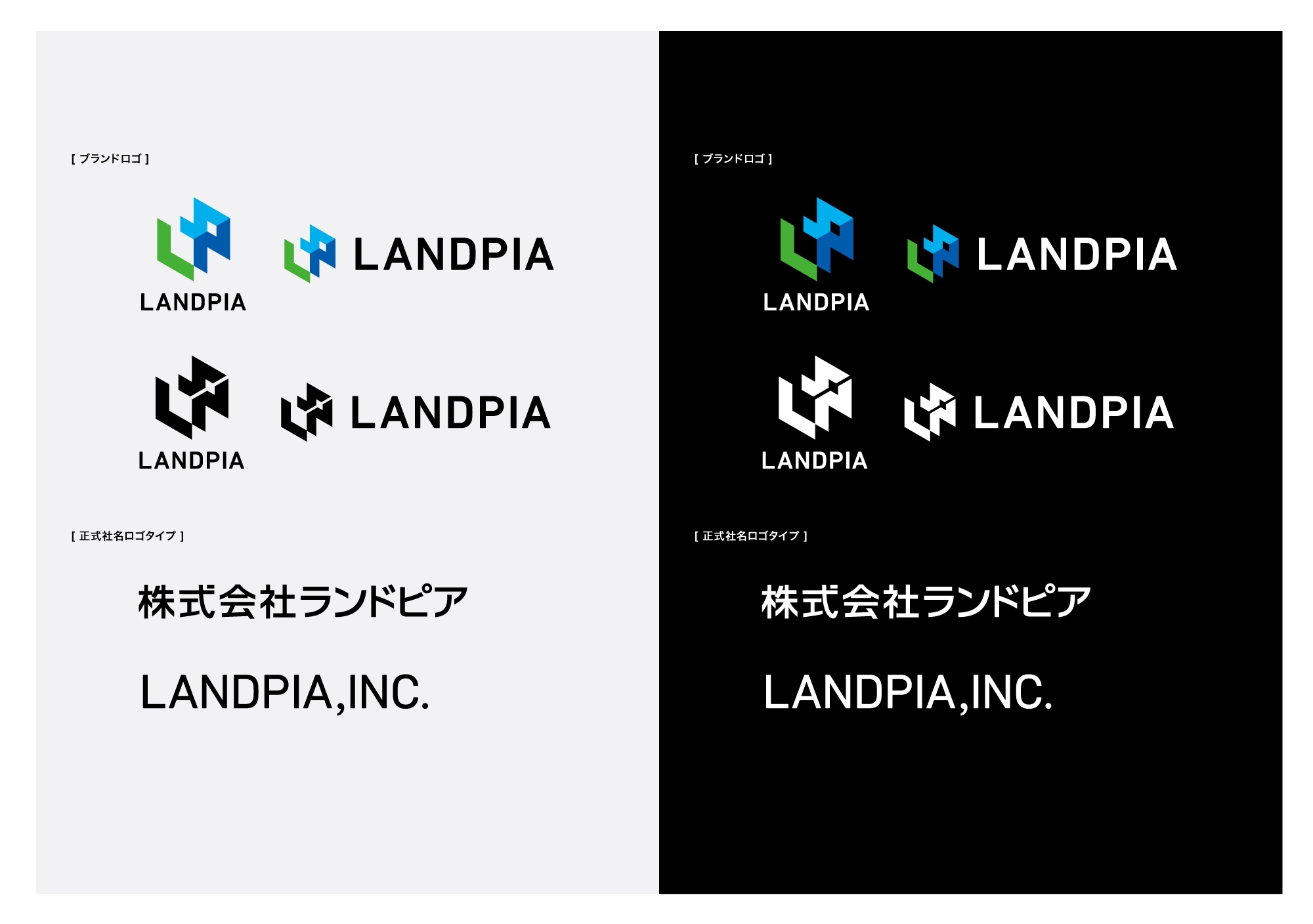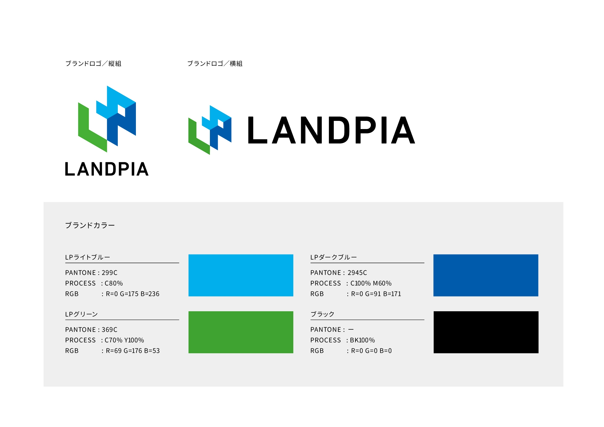 ブランドロゴは2種類(縦組み・横組み)あり、ブランドカラーは“空間・層”の表現に必要な「LPライトブルー」「LPダークブルー」「LPグリーン」「ブラック」の色で構成されています。