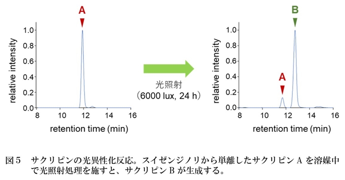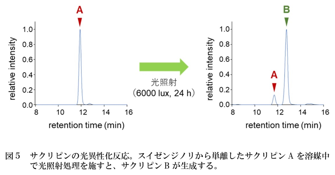 上述したサクリピン A, B の抗酸化活性と抗糖化活性の測定結果から、サクリピン A とサクリピン B で活性の程度が異なることが分かりました。抗酸化活性はサクリピン B の方がサクリピン A よりも高い活性を示しました。抗糖化活性では、コラーゲンに対してはサクリピン B が、エラスチンに対してはサクリピン A が、それぞれより高い活性を示しました。したがって、サクリピンを応用利用する場合には、用途によってサクリピン A とサクリピン B の比率調整が必要となります。この問題を解決する方法として、私たちはサクリピンの光異性化反応 注8) を 発見しました。この反応では、サクリピン A に光を照射することでサクリピン B に変換することができます(図5)。乾燥スイゼンジノリにはサクリピン A が9割程度と多く含まれています。今回発見した光異性化反応により、スイゼンジノリ中に含まれるサクリピン A に適当な光照射処理を施すことで、サクリピン A とサクリピン B を好みの割合に調節することができます。