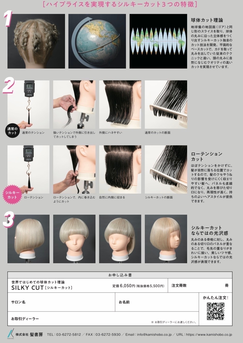 SILKYCUT理論は、ヴィダル・サスーンの革命的カット技法以来となる画期的な理論であり、従来の西洋式カットでは難しかった軽やかな質感と自然なフォルムを実現します。頭部を「球体」と捉える発想から生まれたこの理論は、アジア人女性特有の硬く直毛になりやすい髪を扱いやすくし、その美しさを最大限に引き出すことを可能にしました。本書では理論の背景から具体的な技法までを詳述しており、SILKYCUTを新たなアジア髪のスタンダードとして確立し、西洋のカット技術では得られない一段上の美しさを提案しています。