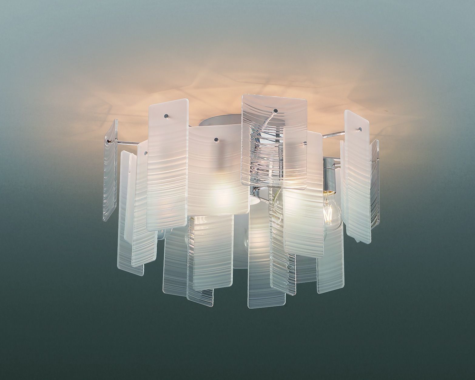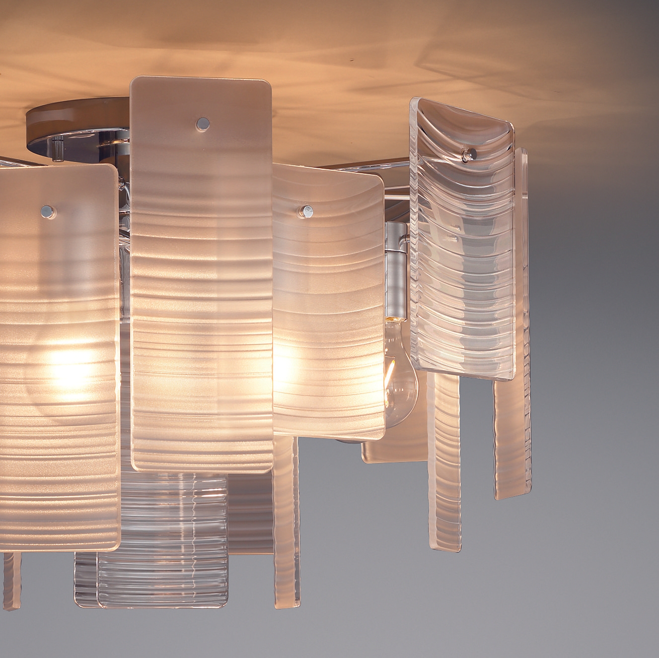 「アーバンシック」という概念で新しく創り出したスタイリッシュなシャンデリアライト。リズミカルに重ね合わせたパネルは軽やかな立体感と透明感を醸し出し、あかりを灯すと波をイメージした波紋柄のパネルが浮かび上がり美しい陰影と優しいゆらぎ感を演出します。