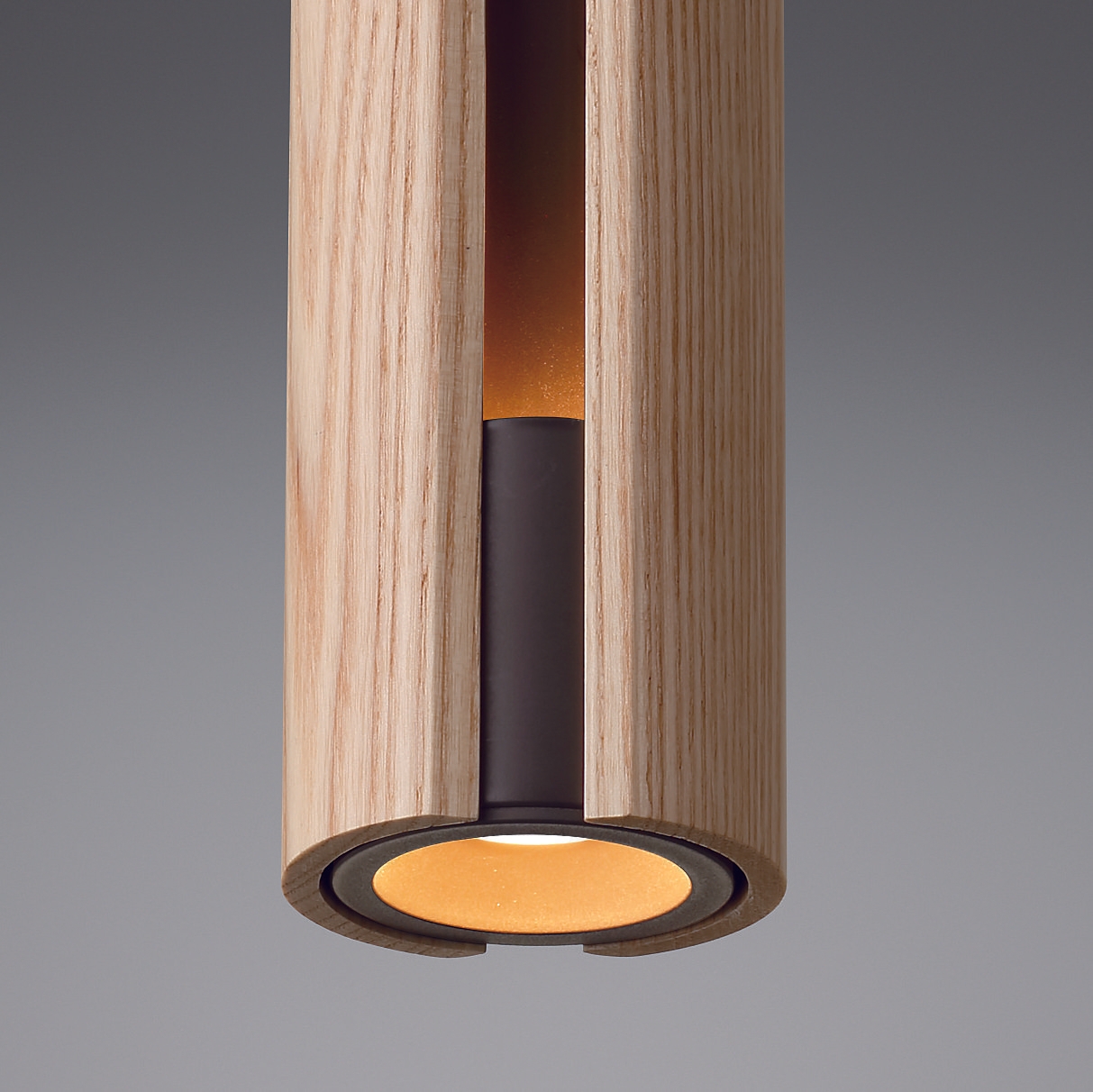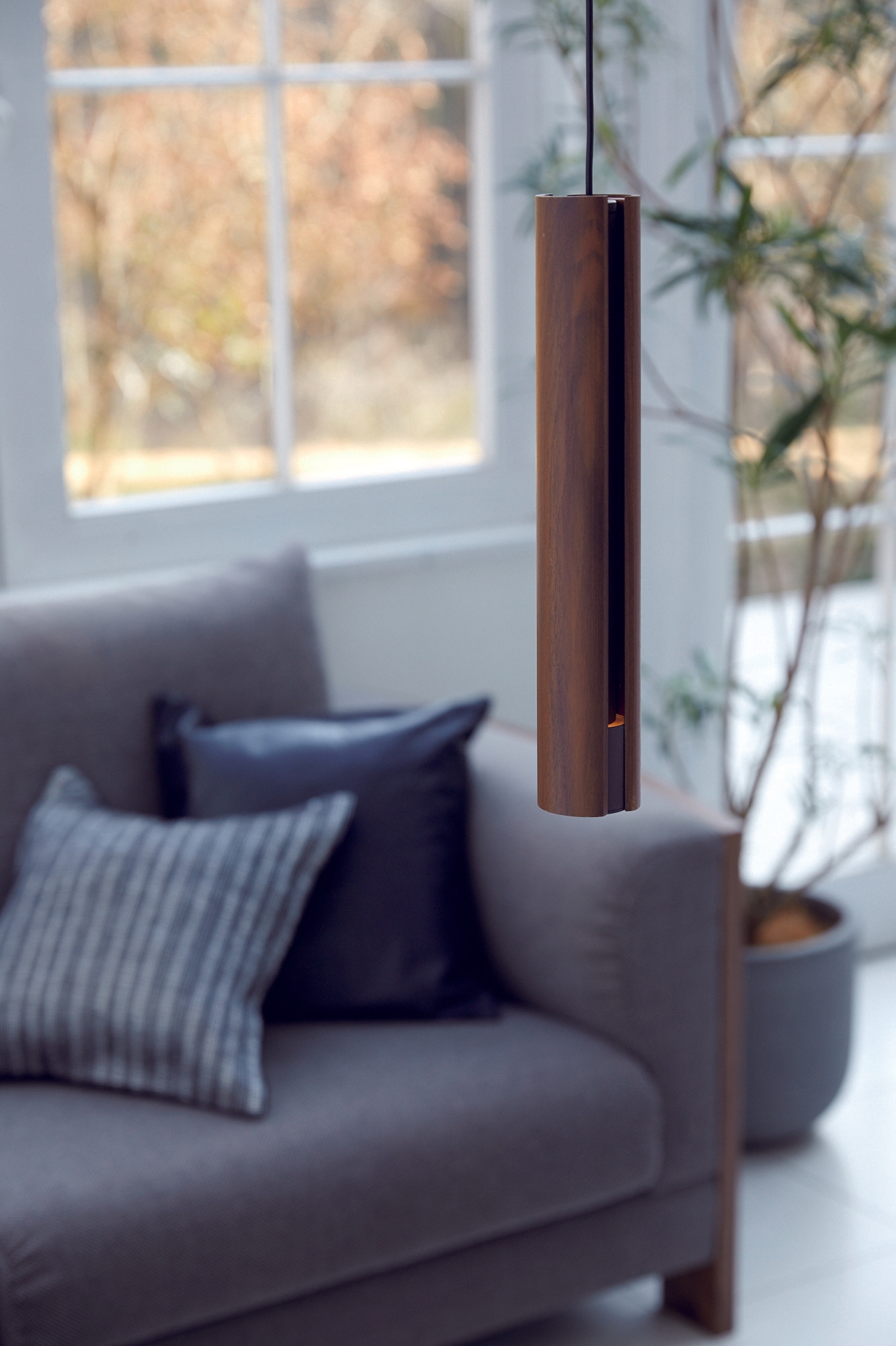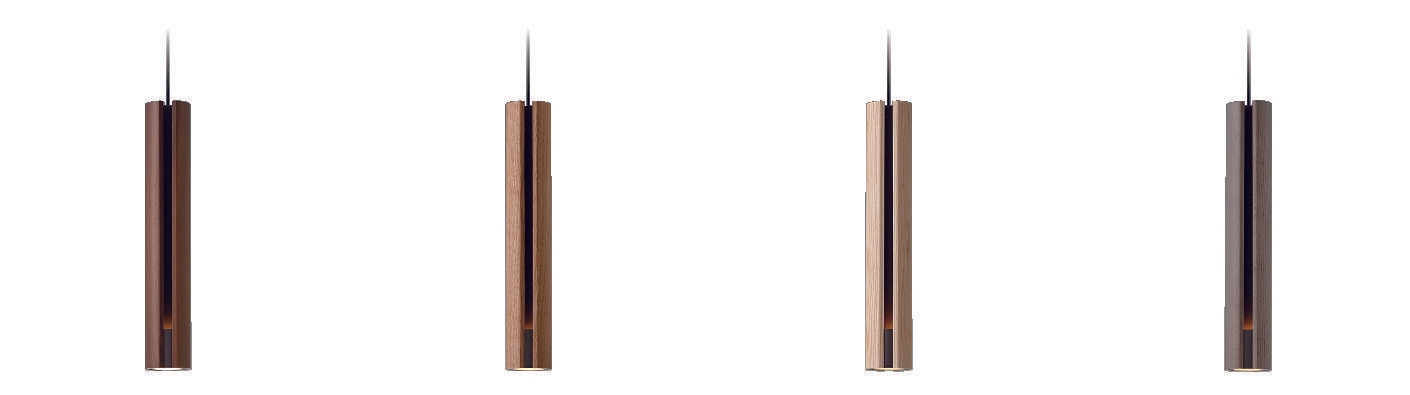 無垢の木ならではの素朴なあたたかさと、対照的なソリッドなストレートラインのデザインが印象的なペンダント。落ち着きのある空間を演出します。マットチャコールグレーを施した内側パイプに光が広がり、やさしい表情を見せると同時にしっかりと下方を照らします。灯具径はわずか67mmで、木は集成材を使わず1本の木から切り出したものを使用しているため、継ぎ目が見えず木目を生かした高級感のある仕上がりとなっています。