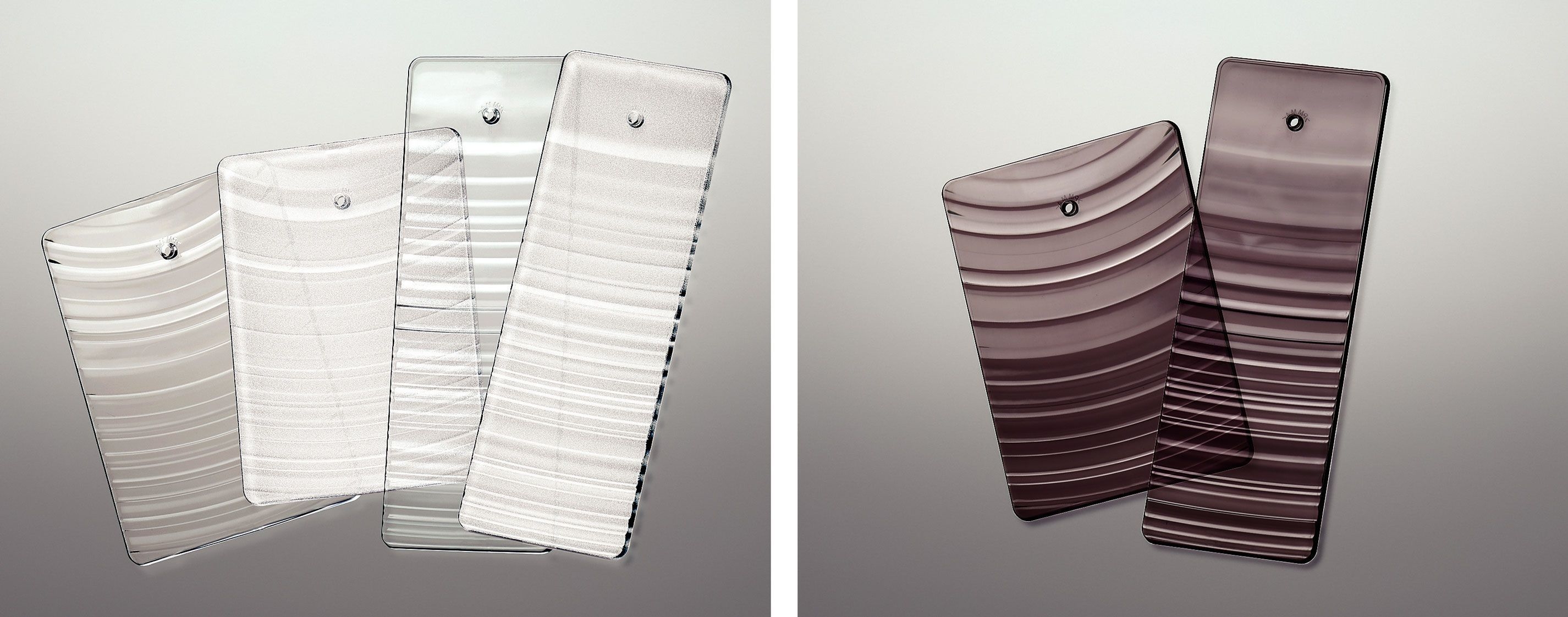 透明/透明消しのタイプは2種のサイズと仕上げで構成しています。それ以外の透明、透明消し、スモークは2種のサイズと1種の仕上げで構成しています。大小のサイズのパネルを重ねることで奥行きと魅力的な立体感を出し空間に華を与えます。