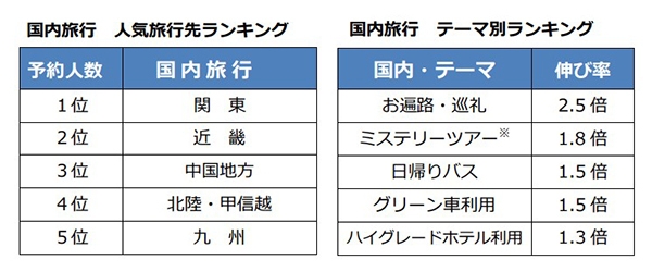人気旅行先で1位となった関東は、邦船による小笠原諸島クルーズや季節の花の観賞を目的とした周遊ツアーが人気となっています。2位の近畿、3位の中国地方では、日帰りバスツアーが牽引し、前年比1.5倍で、全体に占める割合も10ポイント上昇しています。この時期に見頃を迎える花を観賞するツアーやゴールデンウィークに開催されるイベントに参加するツアーの集客が伸びています。また、テーマ型ツアーも好調で、今年は4年に一度の逆打ち年にあたるお遍路・巡礼のツアーが前年比2.5倍となったほか、ミステリーツアーも前年比1.8倍となりました。