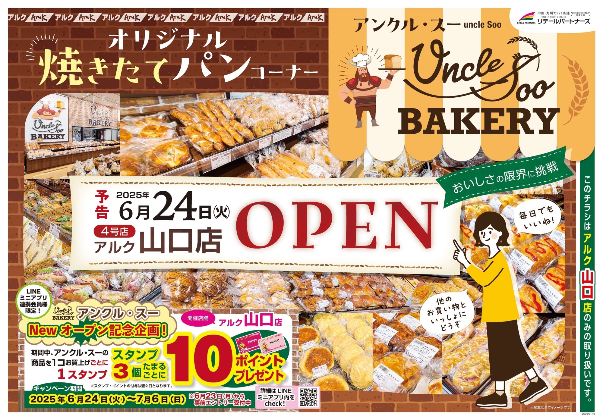 2025年6月24日(木)、株式会社リテールパートナーズの事業会社である株式会社丸久(本社:山口県防府市/代表取締役社長:田中康男)はアルク山口店(山口市中央四丁目7番20号)にオリジナル焼きたてパンコーナー「アンクル・スー」 をオープンいたします。