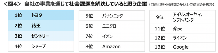 「自社の事業を通じて社会的な課題を解決している」と思う”CSV企業”を自由回答で聴取した。1位「トヨタ」 2位「花王」 3位「サントリー」が上位の回答に上がり、4位以下では「シャープ・パナソニック・ユニクロ・イオン・Amazon・アイリスオーヤマ・ソフトバンク・楽天・ライオン・Google」などがあがった。<図4>