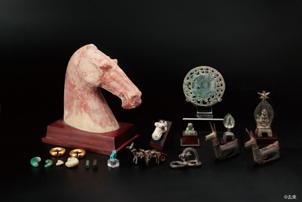 ・去来:縄文注口土器、呉須染付牛図茶碗、須恵器壺、青銅観音守仏、画像石拓本