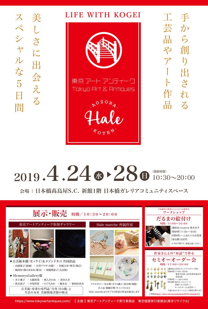 「日本橋ガレリアコミュニティスペース」(中央区日本橋2-5-1)では、東京 アート アンティークのインフォメーション拠点として機能する他、アート&クラフト市の姉妹ブランド「Hale marche」とのコラボレーション企画として、「LIFE WITH KOGEI」と題し、工芸作品、ワークショップ、アクセサリーのセミオーダー会など、手から創り出される作品の美しさに触れて知ってもらうための展示・販売イべントを開催します。特に若い人が工芸品やアート作品を暮らしに取り入れるきっかけとなる機会を作ります。