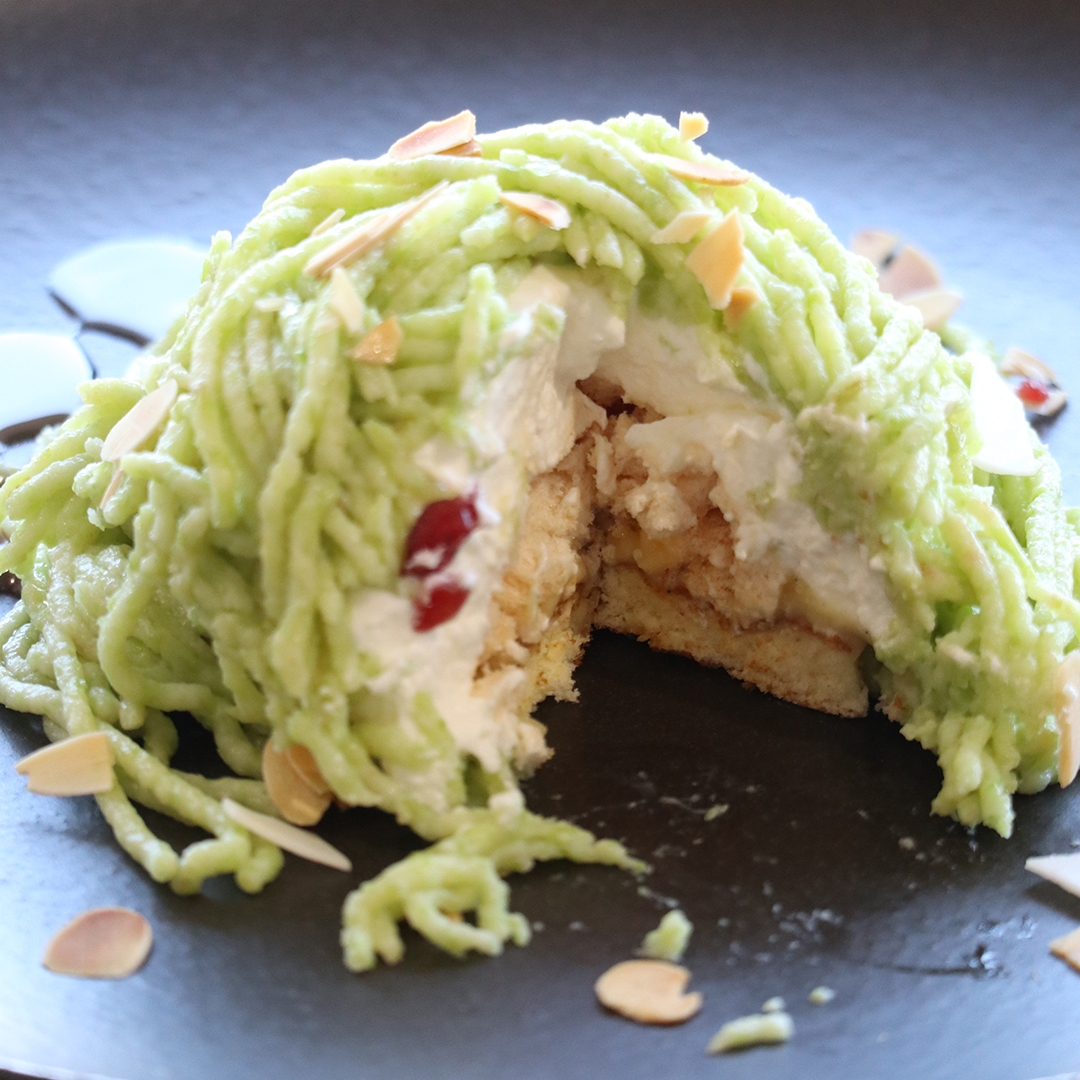 枝豆モンブランは、細く長く絞りだした枝豆色のクリームと、何層も様々な食感が織りなす絶妙なハーモニーが特徴。枝豆クリームと一緒に、トッピングしたローストアーモンドスライス、ラム酒漬けドライクランベリー、ホワイトチョコレートのチップをお楽しみいただけます。濃厚なキャラメルソースをアクセントにつけて楽しみながら味わうこともできます。食べ進めると、中にはふわふわのスポンジに、濃厚なカスタードクリーム。サクッと焼メレンゲに、とろけるホイップクリームが入っています。枝豆本来の芳醇な香りや自然な甘さを存分にご堪能いただける枝豆モンブランを、是非この機会にお楽しみください。