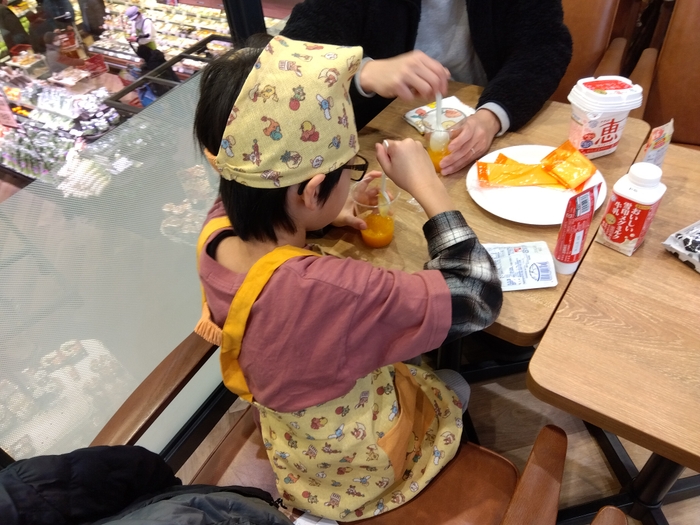 雪印メグミルクからは、牛1頭からどれくらいのミルクが搾れるのか、ミルクからどんな食べ物が作られているかなどの話や、潰したみかんにヨーグルト、練乳、牛乳を混ぜて作る“ラッシー作り”を体験いただきました。
