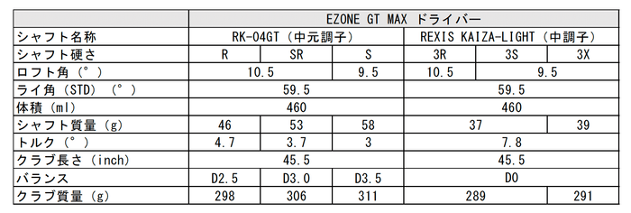 EZONE GT MAXドライバーは純正のRK-04GTシャフト(2G-Namd™ Flex Force 複合)のほか、REXIS KAIZA-LIGHTシャフト搭載モデルも同時に発売いたしますので、スウィングタイプにあったシャフトをお選びいただけます。