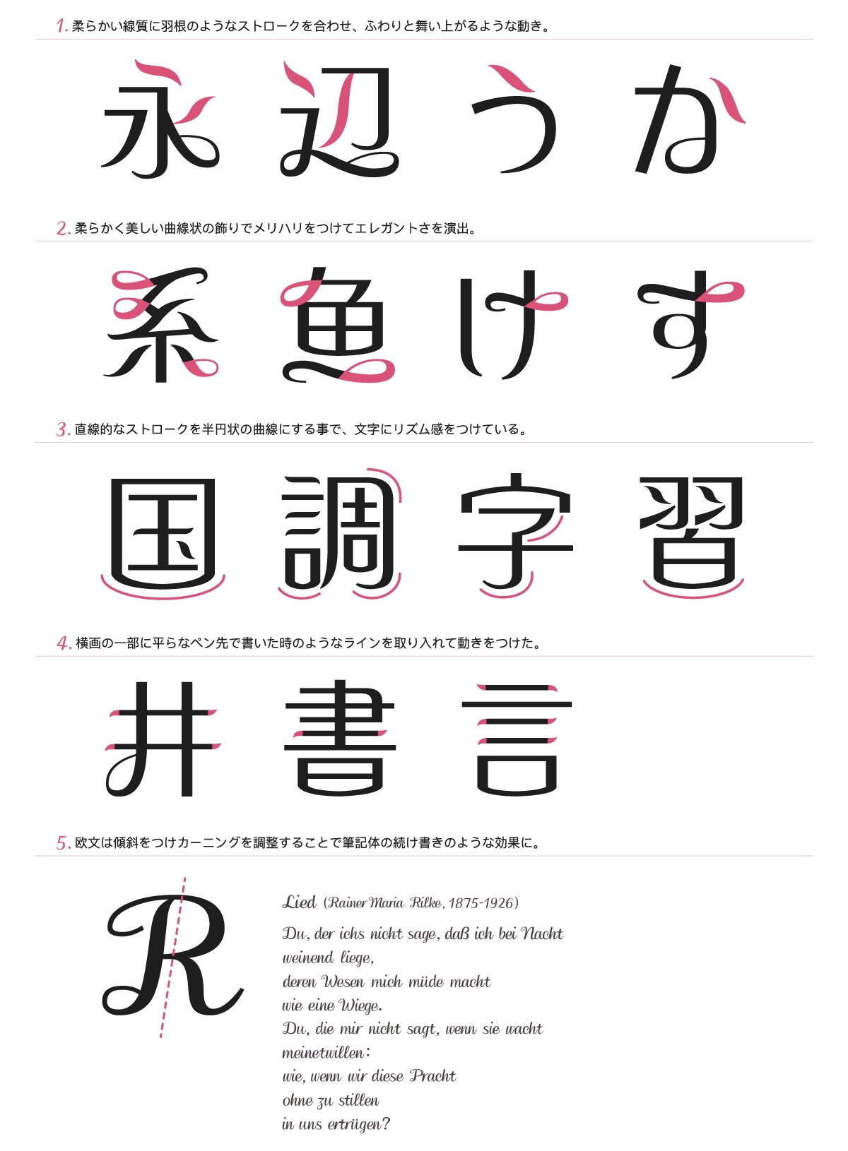 華やかで美しい欧文の手書き文字を参考に、漢字や平仮名のデザインにもカリグラフィー特有の滑らかで抑揚のあるループを取り入れました。全体的に丸みのあるスタイルでありながらも、軽やかさや上品さも感じることができます。