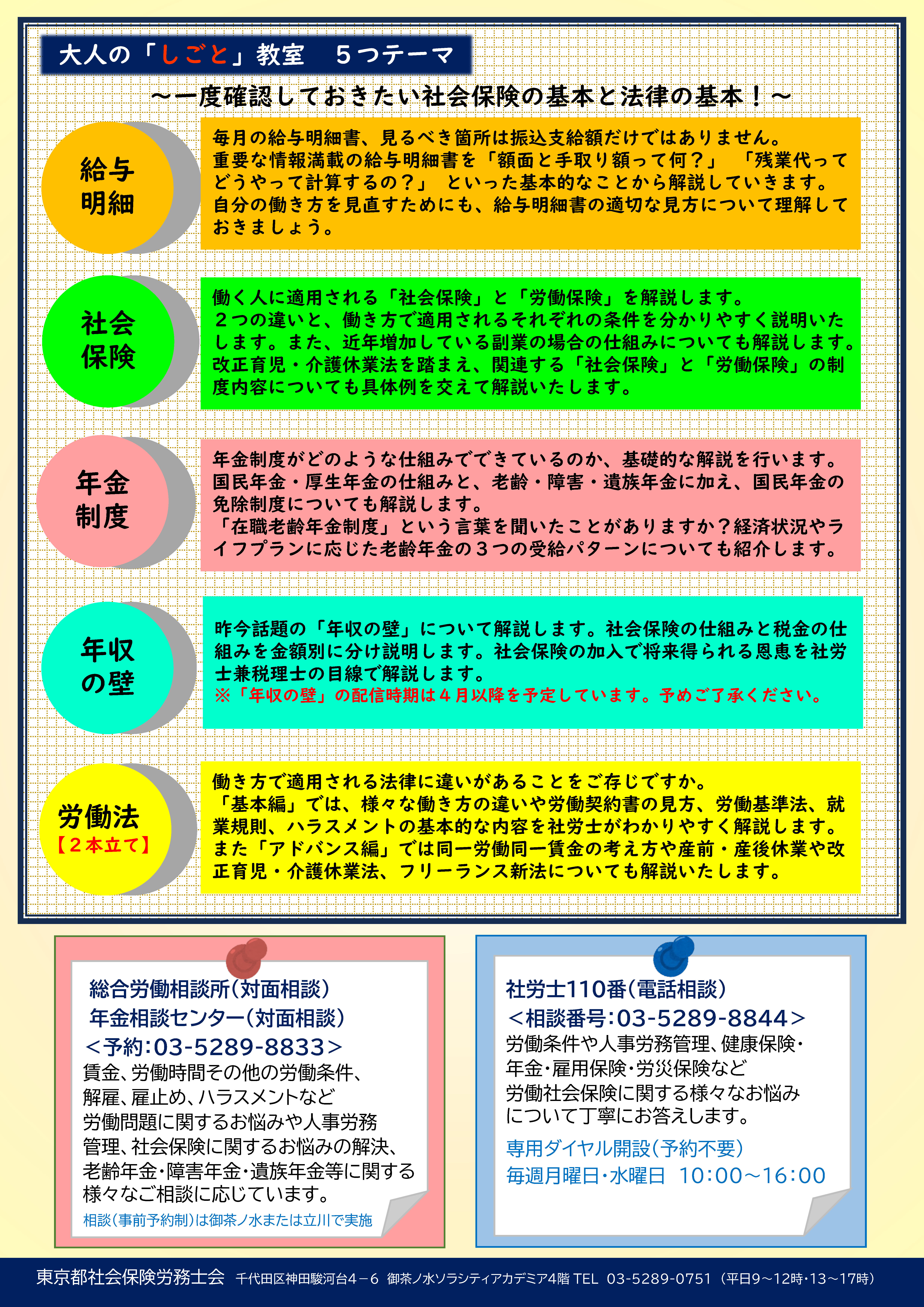 東京都社会保険労務士会(会長:寺田 晃)は、「みんなが輝く社会を、みんなが輝く会社を」をテーマに第4弾となるセミナー『社労士が解説!知っておきたい大人の「しごと」教室 ~自分で選ぶ働き方 給与明細の見方から年金まで~』を開催。2025年3月21日(金)から5月30日(金)まで、YouTubeにて配信いたします。