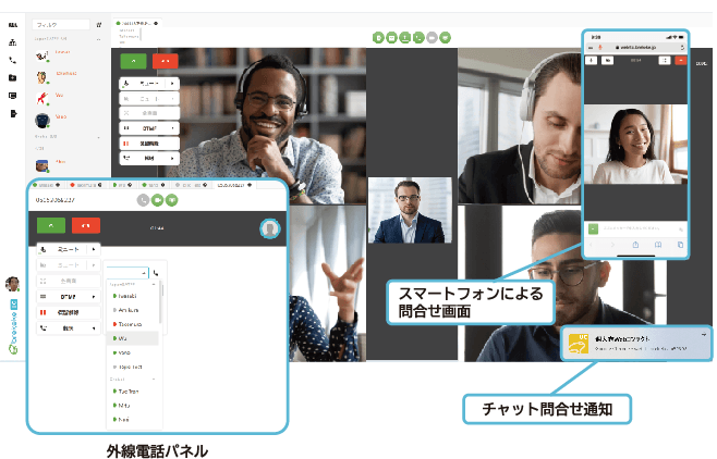 ・オフィスのUC(ユニファイドコミュニケーション)環境を実現するアプリケーションです。テレワークにも適したコミュニケーションツールとして、スタッフ同士で使用するだけでなく、ウェブサイトやSNS(Twitter、Facebook、LINEなど)を窓口として社外からの問い合わせを受けたり、ミーティングを行ったりすることができます。