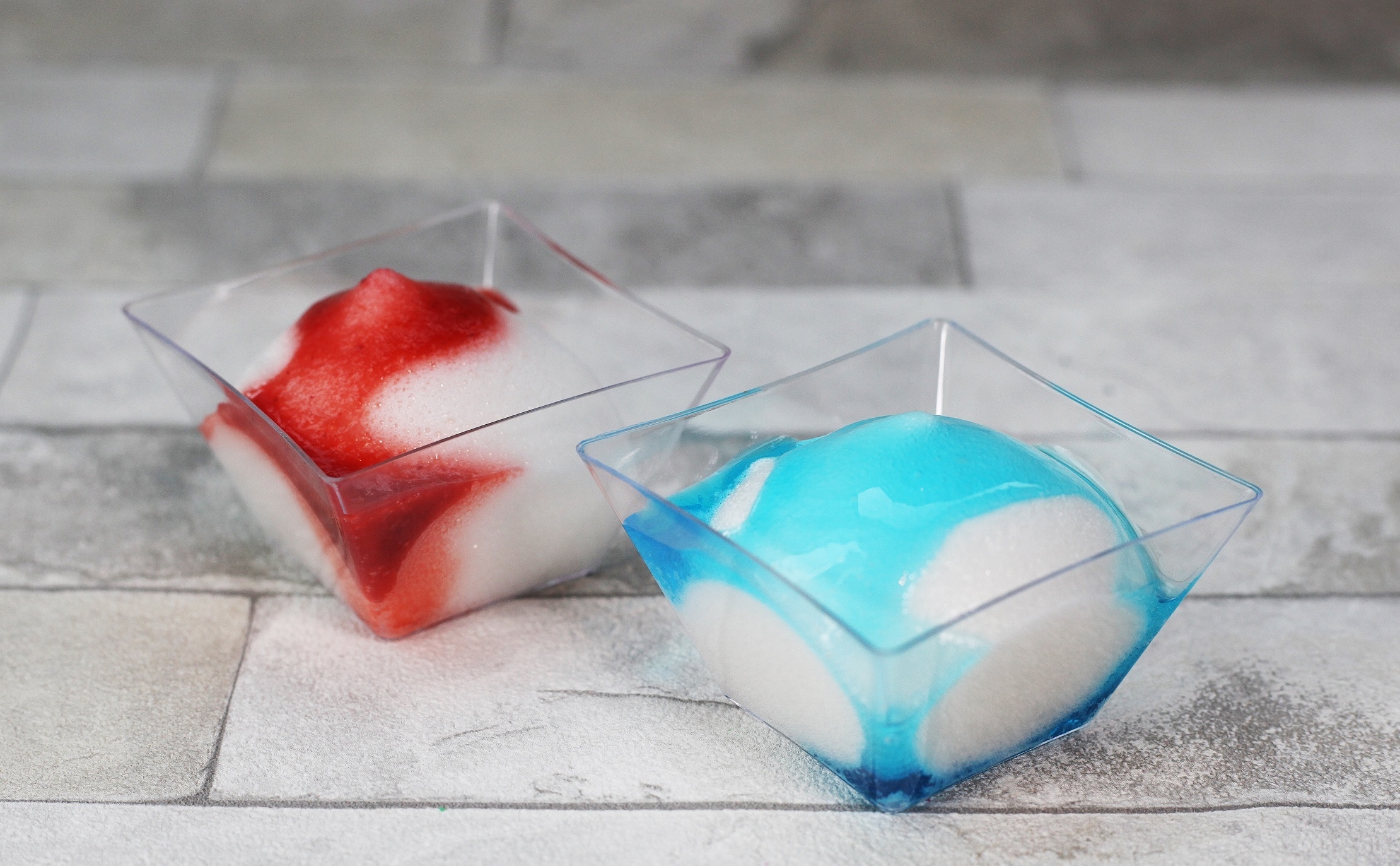りんご味の泡に、苺やブルーキュラソーをかけてかき氷風に!