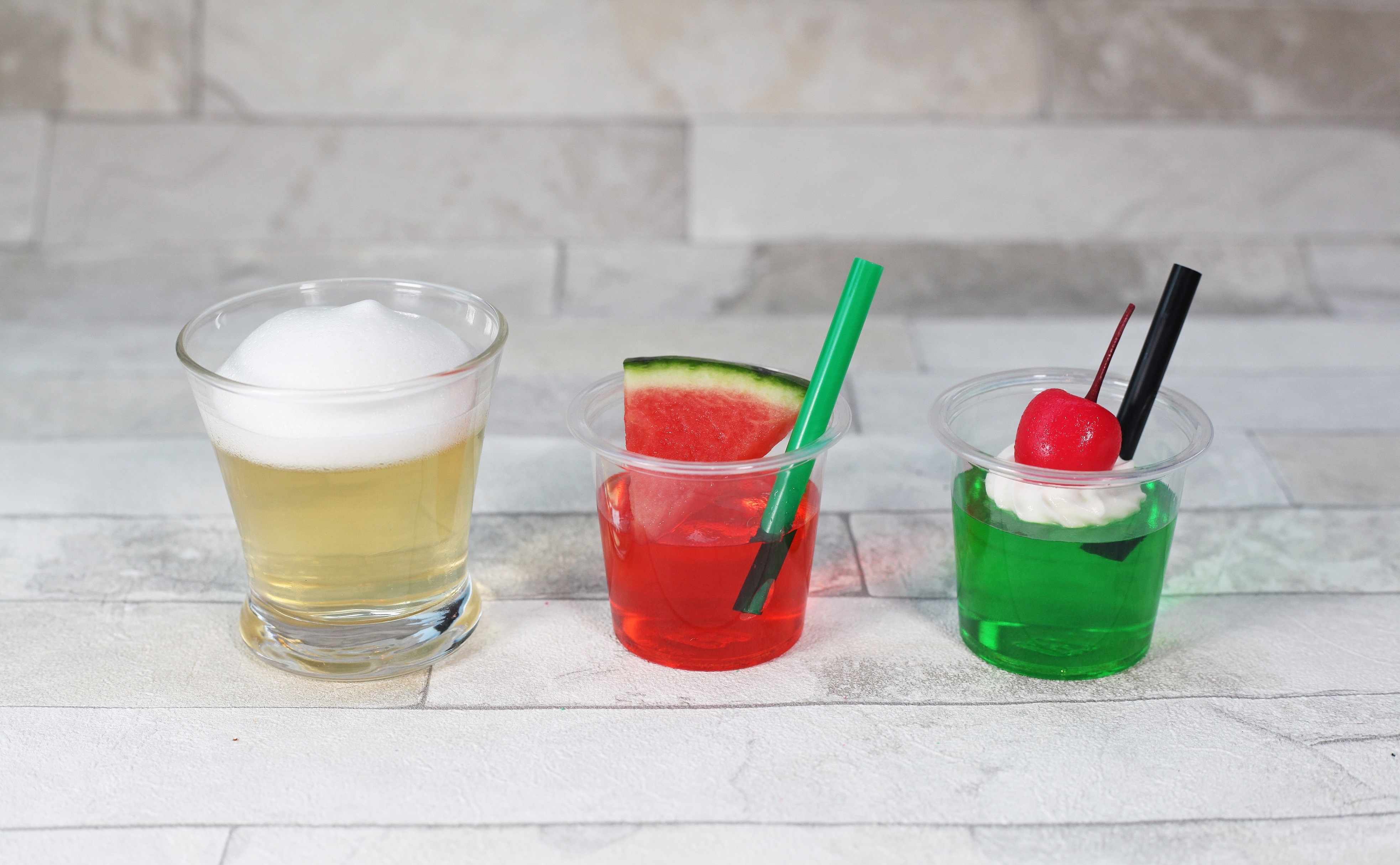 ビールに見えるのにお子様でも美味しく召し上がれるビール風りんごゼリー、すいかジュース、クリームソーダゼリー。
