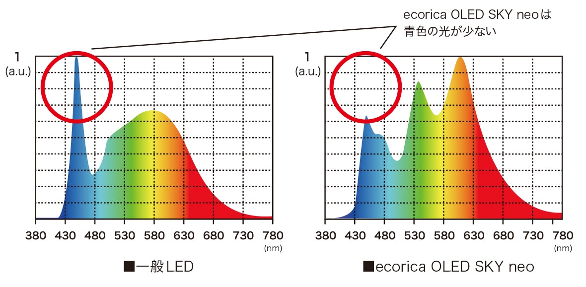 ■一般的なLED照明に比べてブルーライトの発生が少なく、ブルーライトによる目の負担や、夜間にブルーライトを多量に浴びることが原因ともいわれる「体内時計の狂い」が引き起こす、睡眠障害のリスク軽減が期待できます。