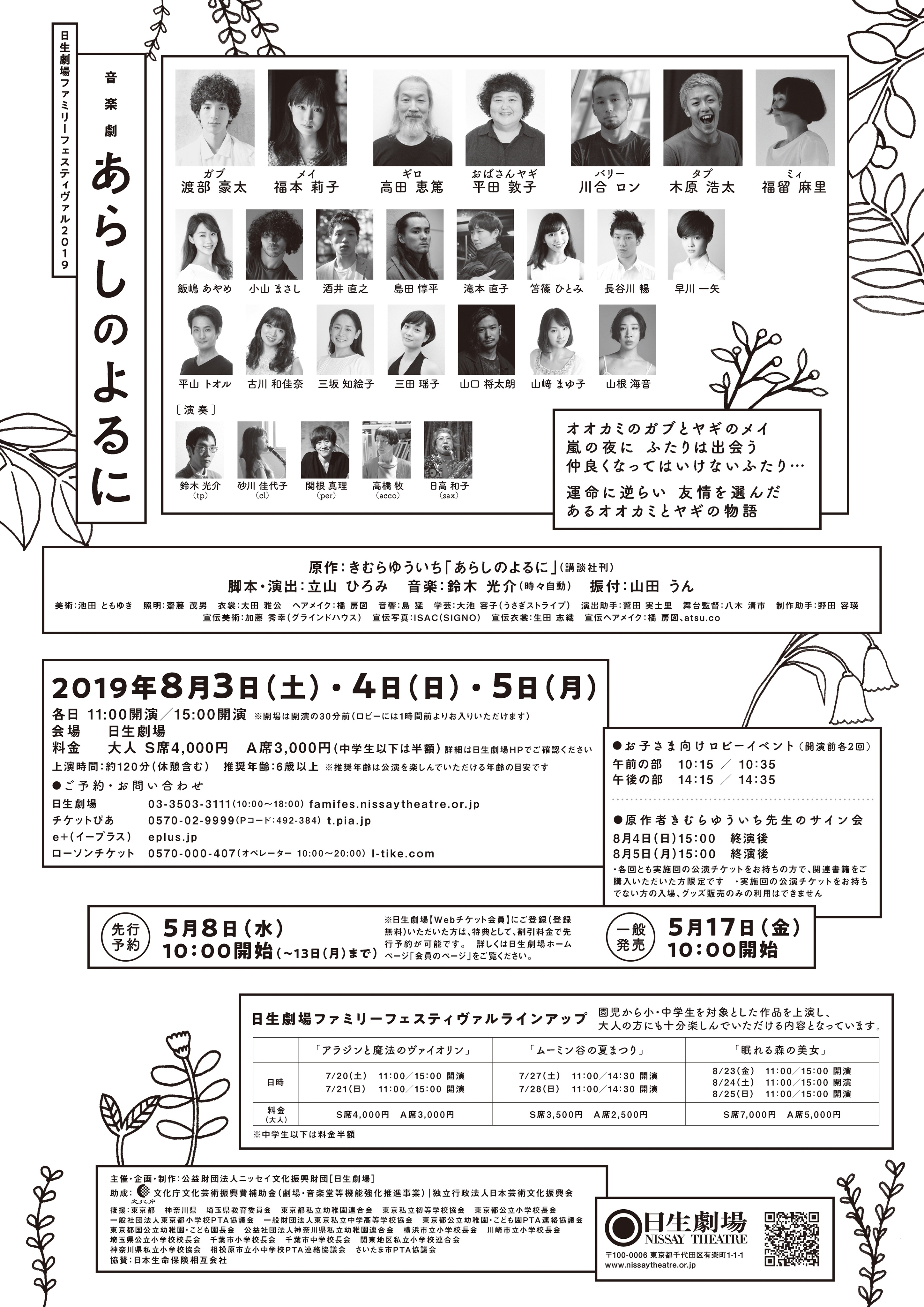 原作は刊行25周年・シリーズ累計350万部、子どもから大人まで、感動をよびつづけている名作「あらしのよるに」。オオカミとヤギが「食う」、「食われる」の関係をこえて友情を育てるストーリーを、日生劇場がファミリー向け音楽劇として新制作します。