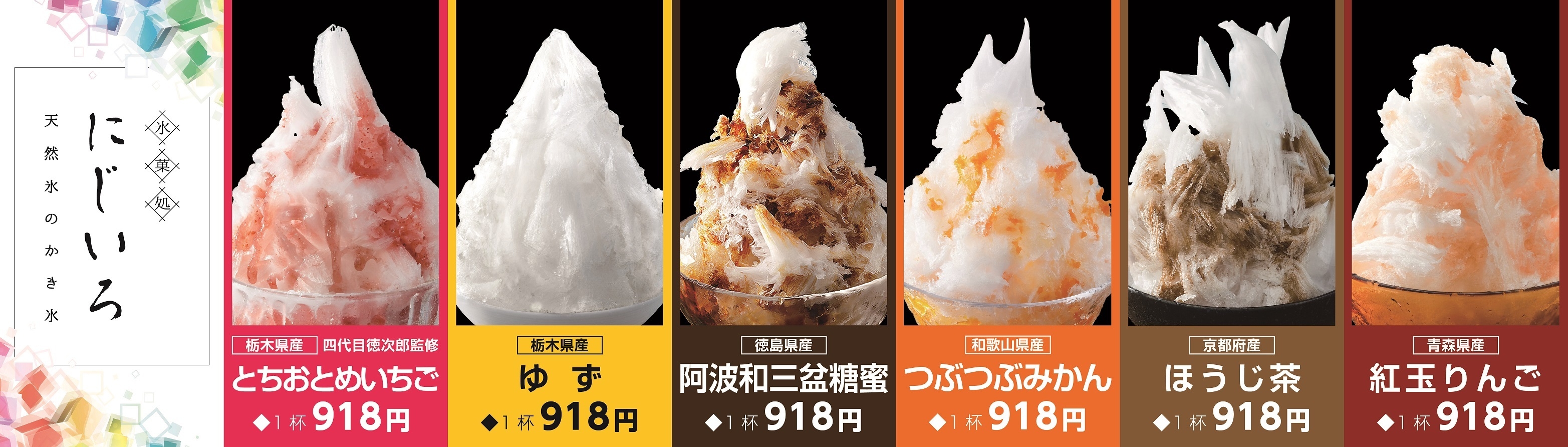 株式会社ジェイフード(所在地:愛知県名古屋市)は、二子玉川、名古屋、広島の4つの百貨店で日光の「四代目徳次郎」の天然氷を使用したかき氷専門店“氷菓処にじいろ”のかき氷を期間限定で販売します。