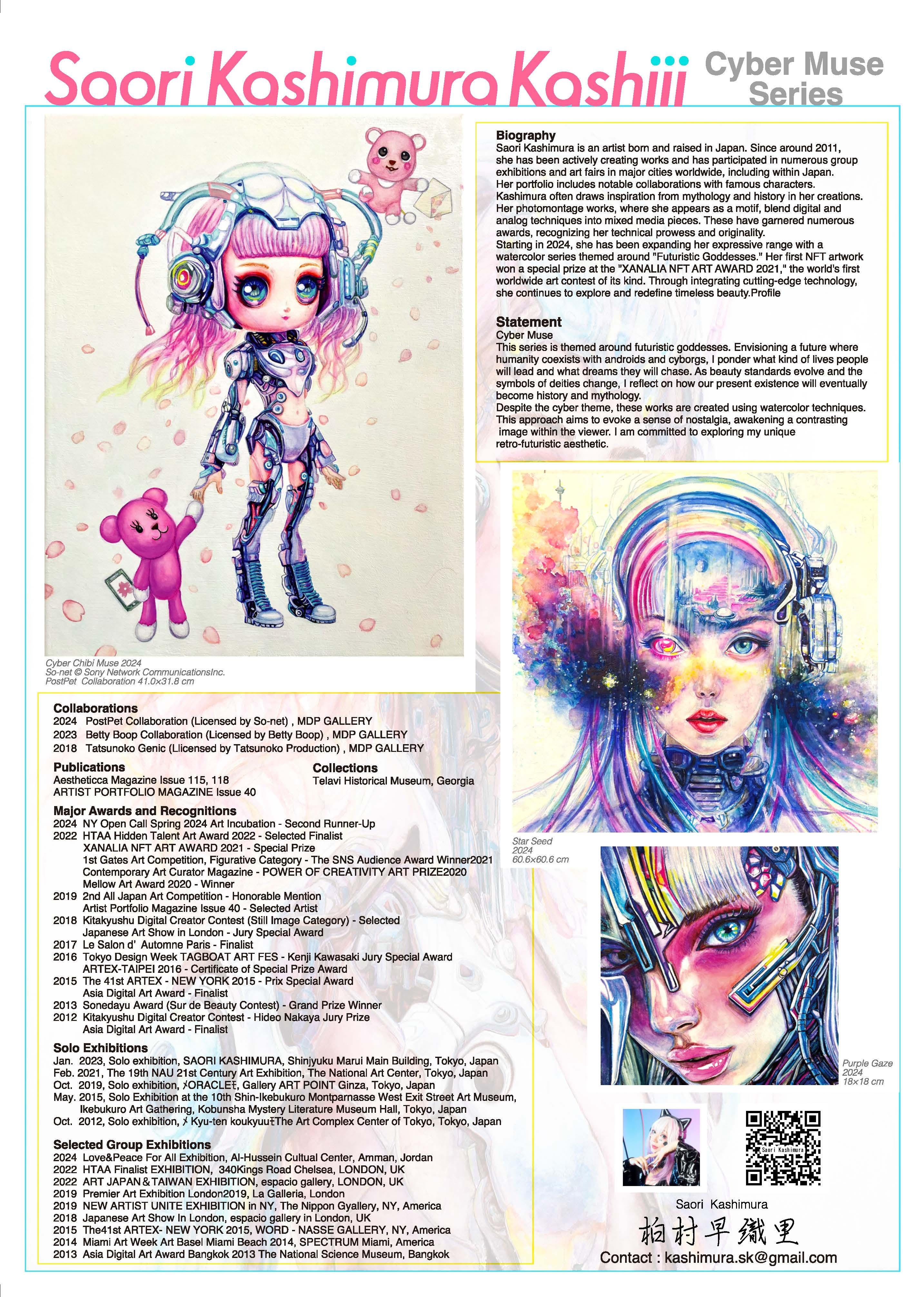 現代美術アーティスト。武蔵野美術大学空間演出デザイン学科卒業。神話や歴史から着想を得た、物語性のある世界を美しい色彩で表現。2011年頃からデジタルとアナログのミクストメディアの手法で作家活動を展開。コロナ禍を経て、本年2024年からは、手描きの水彩画で(近未来の女神)のシリーズに取り組む。国内はもとより、海外開催のアートフェア、ギャラリー展示に数多く参加。独自性と技術力の高さが評価され、受賞入選多数。また、企業コラボも得意とし、タツノコプロ、ベディブープ、Postp Pet 等人気キャラクターとのコラボアート制作(MDP GALLERY 企画)も行い、表現の幅を広げています。先月8月末には、マルイ新宿本館で開催された、BEAUTY STAND PLUSのビューティーウェルネスイベント「BSP for SBW」にて作品展示も行っております。