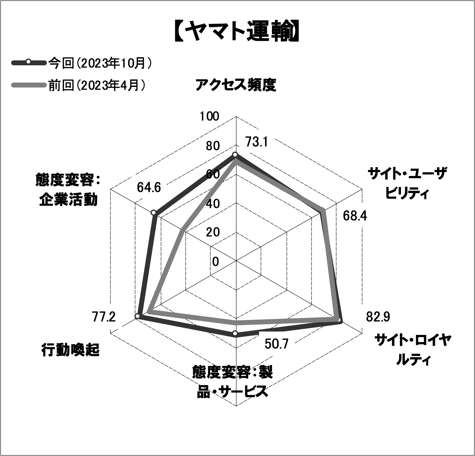 「ヤマト運輸」は、一般企業サイト内順位が前回第13位から第1位に上昇し、2022-春夏以来の首位を獲得した。500サイトでの全体順位は第6位となった。WBIは前回のスコアから10.7ポイント増の78.4ポイントだった(図表2)。個別の指標では、「態度変容:企業活動」が21.8ポイント増と大幅に上昇し、64.6ポイントの高評価を獲得した(図表3)。サイトトップページの構成に大きな変化はないが、生活に密着した信頼感のあるサイトとして、高い評価を得ている。