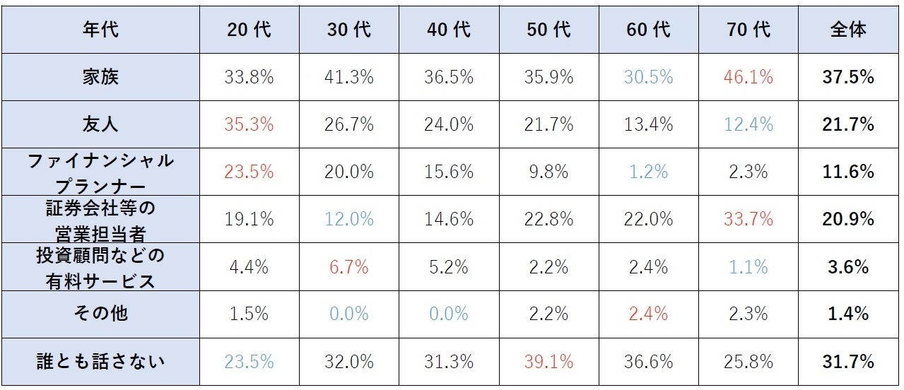 株式投資について普段、情報交換などの会話をする相手についても質問しました。その結果、若い世代ほど数値が高くなる傾向にあったのは「友人」と、意外にも「ファイナンシャルプランナー」でした。