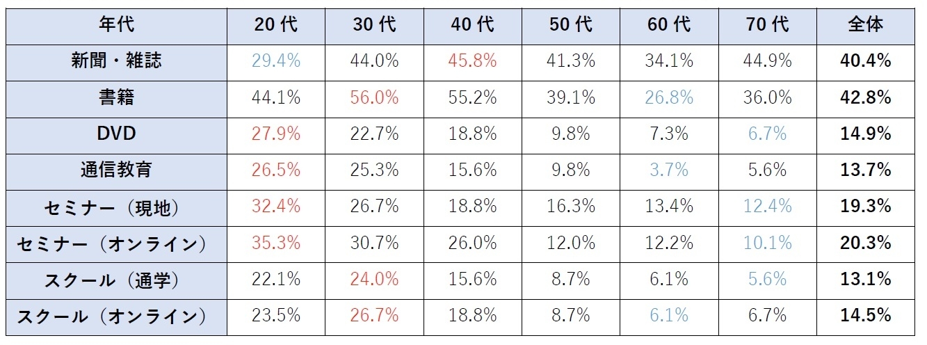 なお、全体として最も割合が高かったのは「書籍」の42.8%で、手頃であることから学習の入り口になっていることがわかります。その一方で、「DVD」や「通信教育」「セミナー」「スクール」といった、ある程度のお金を投じる必要のあるツールについては20代・30代といった若い世代の割合が高く、ここからも、若い人ほど株式投資の学習に積極的にお金を使っている実態が見えてきます。