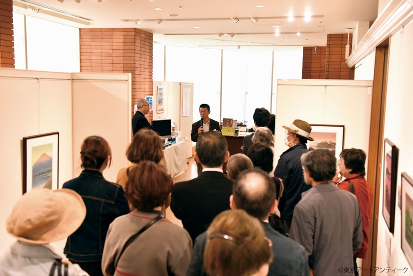 同時開催「―新版画の美― 川瀬巴水木版画展」をご覧頂きながら、三代目 渡邊章一郎が解説いたします。