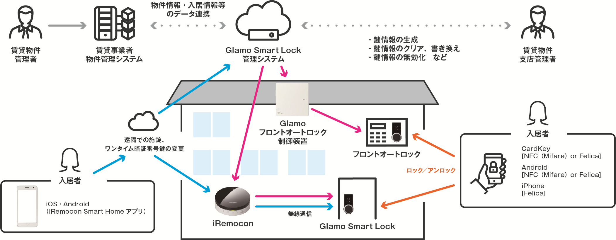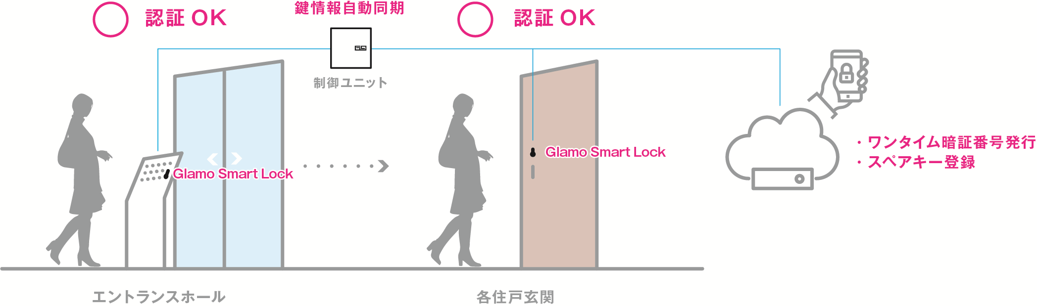 Glamo Smart Lockとフロントオートロック制御ユニット『IRU-03ZWIF(ES)』を連携させることにより、スマホから発行したワンタイム暗証番号や、ユーザーが発行したスペアカード等の情報が自動で同期され、エントランスや各住戸の玄関を同じ鍵で解錠可能となります。