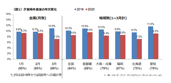 夕食時外食率3月は前年比66% 自治体の自粛要請が行動抑制のきっかけに