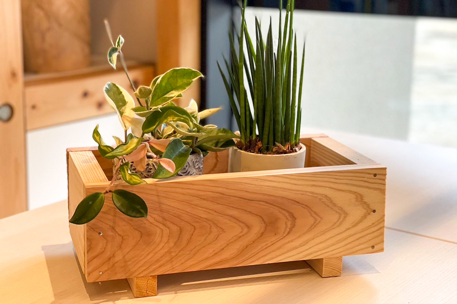 スクエアプランター、もしくは三角足の花台の2種類からどちらかを選んでお作りいただけます。スクエアプランターは、造りがしっかりしたシンプルデザインで長くご愛用いただけます。花台は、横板を好みの長さにできるので、飾りたい場所にぴったりのサイズで作ることができます。作品は当日お持ち帰りいただけますので、マルシェで出会った植物や雑貨をさっそくおしゃれに飾れます。