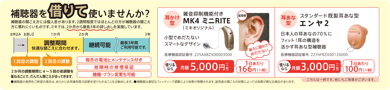 月額3,000円~(+税) 定額にて補聴器を貸出いたします。使えるようになるか不安な方は、まずは補聴器を借りることから始めてみませんか?