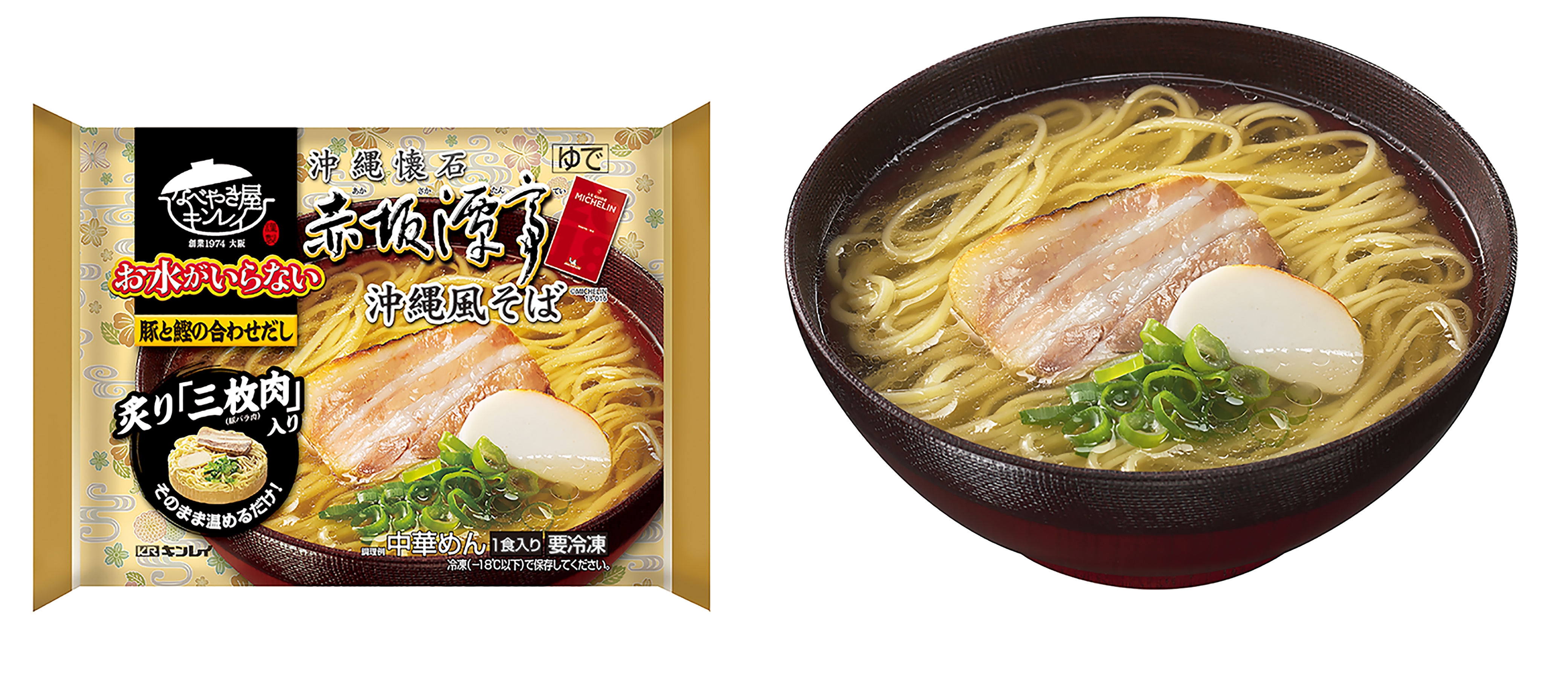 ミシュランガイド東京にて7年連続*で一つ星として掲載された「沖縄懐石 赤坂潭亭(おきなわかいせき あかさかたんてい)」監修商品です。昆布と鰹から丁寧にとった雑味のないだしに、豚の旨味が溶けこむ味わい深いスープ。炙り三枚肉、焼かまぼこ、青ねぎを盛り付けました。麺はつるつるとのど越しの良い、平打ち麺です。