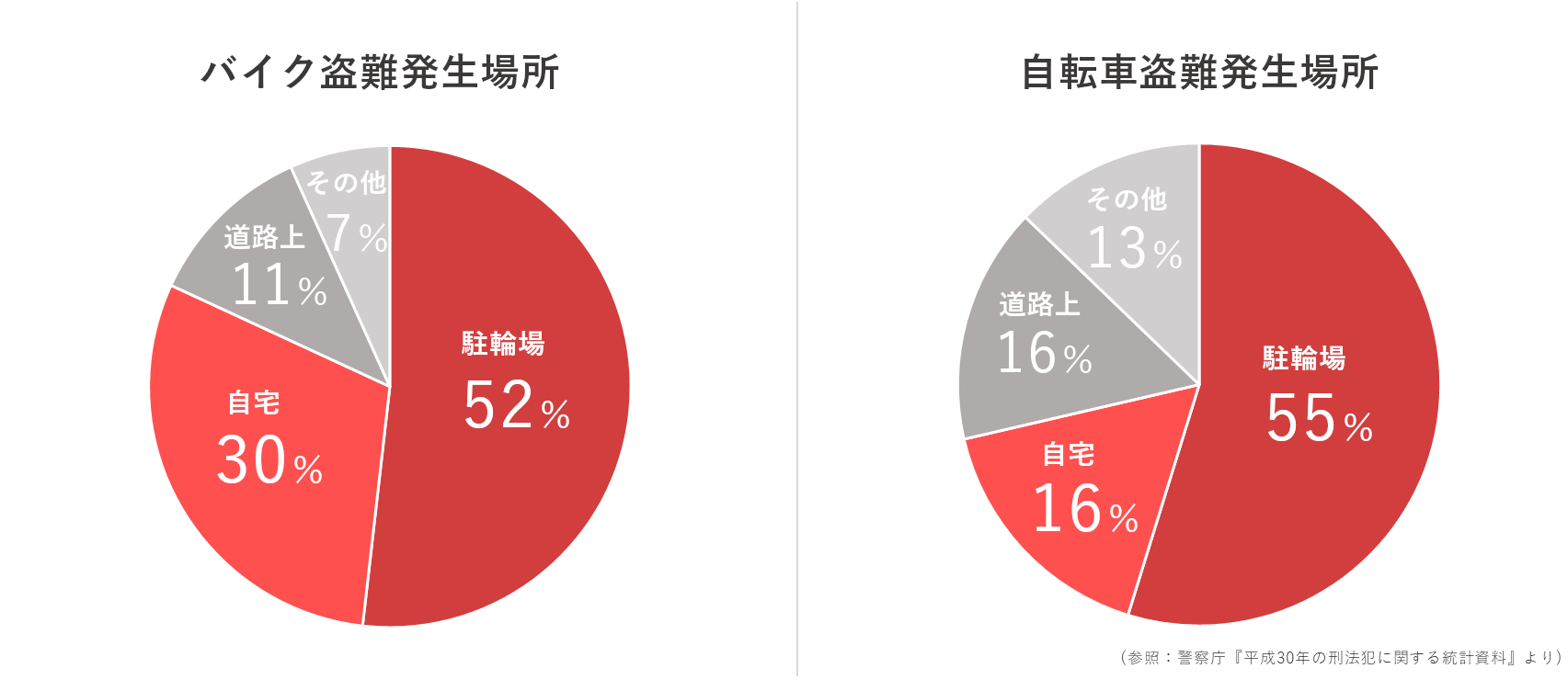 盗難発生場所で一番多いのは「駐車(輪)場」、ついで「住宅」で、バイクでは82%、自転車では71%が全体件数の割合を占めることをご存じでしょうか?