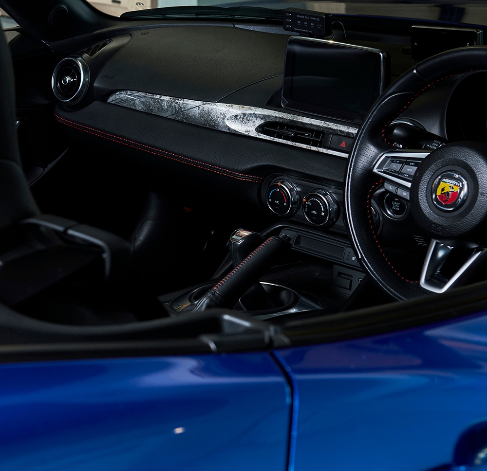 シンプルで合理的にデザインされた車内に、熟練の職人技によって綿密に計算された「箔の美」を取入れる。 空間を引き立てる、陰影による奥行きを表現するために、箔を振り落としては剥がし寂びた様子を残しながら複数の層をつくり出していきます。 アートピースをつくるように、インテリアパネルを装飾します。