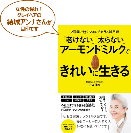 このたび当研究会の井上浩義教授が、主婦と生活社よりアーモンドミルクの効能を医学的根拠をもとにわかりやすく解説した書籍『「老けない」「太らない」アーモンドミルクできれいに生きる』が11月16日(金)より全国の書店にて発売します。本書の帯にて、そのナチュラルなライフスタイルから多くの女性の憧れの的である、結城アンナさんに推薦していただきました。今回の書籍の出版に際し、井上浩義教授にご挨拶をいただきましたのでご紹介します。