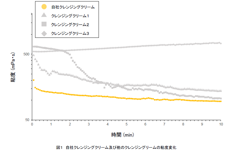 自社クレンジングクリーム及び他のクレンジングクリームについて、「なめらかさ」「のびの良さ」など使用感に関わる物性評価に有用な粘度を測定する測定器(定常流測定機)を用いて、試料に一定の力を加え続けた際の粘度変化を測定しました。その結果、他のクレンジングクリームは変動がない、または粘度が低下するのに時間を要するのに対し、自社クレンジングクリームは測定開始直後に粘度が急激に低下し、その後は非常に低い粘度を保つことが確認されました(図1)。