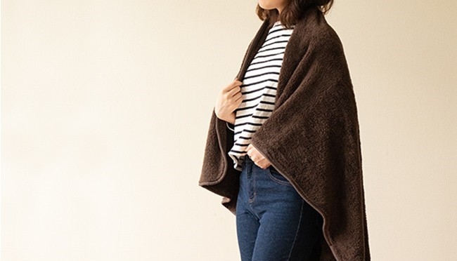 こちらは100×140の大きさのブランケット。羽織る、膝に掛けるの2wayで使用できる。