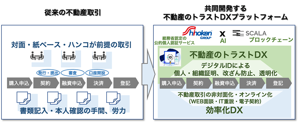 株式会社スカラ(本社:東京都渋谷区、代表者:梛野 憲克、以下「当社」)は、2020年10月14日に、株式会社シノケングループ(本社:福岡県福岡市、代表者:篠原 英明、以下「シノケングループ」)と不動産取引及びライフサポートサービスに関して、デジタルIDを活用した業務支援システム(以下、「本システム」)の共同研究及び共同開発業務提携に関する基本契約(以下、「本業務提携」)の締結を行ったのでお知らせいたします。