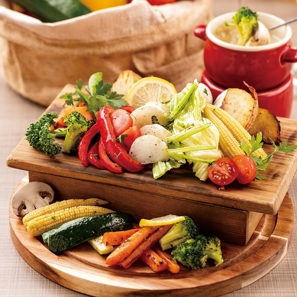 ブラジル直送のシュラスコ機で焼くのはお肉だけではありません。農園野菜をシュラスコ機で焼き上げるとグッと旨味が増します。自慢の焼き野菜をバーニャカウダや複数のソースでお楽しみください。