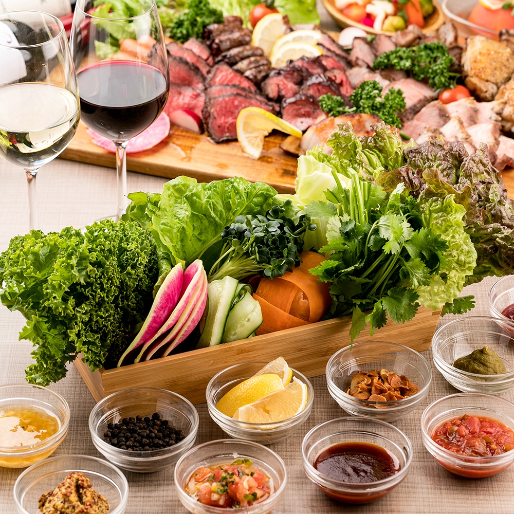 シュラスコのアレンジを楽しむ、包み野菜・ソース・トッピング・パン・トルティーヤ・ライスはすべて食べ放題。その他、「燻製ローストビーフ」や「鴨のタタキ」、「パルマ産生ハムの盛り合わせ」も食べ放題となります。