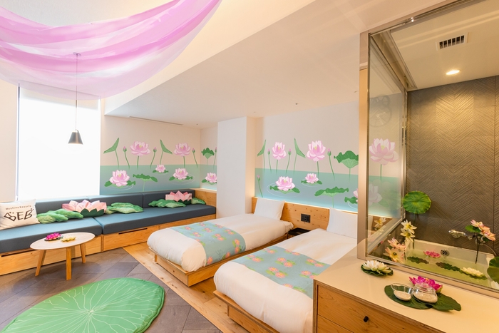 色鮮やかな蓮の花が描かれた壁紙やベッドライナー、蓮の花や葉の形をしたオリジナルクッションなど、蓮で埋め尽くされた客室が登場!蓮の花や葉に囲まれて、映え写真にチャレンジするもよし、ベッドに寝転んで壁の蓮の花を眺めるもよし!時間や天候に左右されることなく、見頃を迎える蓮の花を思う存分楽しめます。