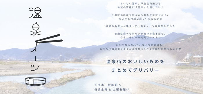 観光産業がストップしている現在、信州随一の温泉街である千曲市の戸倉上山田温泉街を中心に、人を動かすのではなく、美味しい温泉街グルメを中心とした「モノを動かす」ことにシフトしたサービス「温泉イーツ」を始めます。「行楽を届ける」をコンセプトで、旅館、飲食店、食品店、そして地元タクシーを含む配達パートナーがタッグを組み、店を超えてまとめて注文を取り・配達(まとめてテイクアウトをあり)を協業する新しい仕組みです。