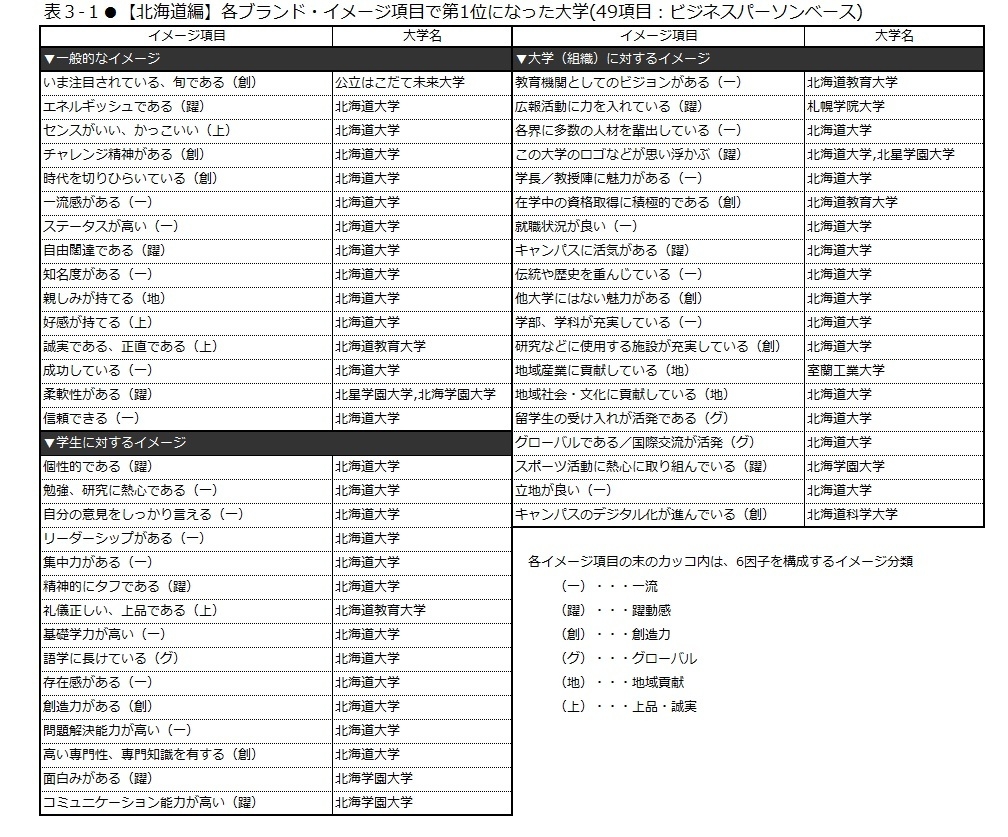 日経BPコンサルティング調べ 「大学ブランド・イメージ調査 2018-2019」 (2018年8月実施)【東日本編】 各地域のブランド力トップは、 北海道大学、東北大学、筑波大学、信州大学 「いま注目されている、旬である」大学に、 国際教養大学、長野県立大学 「広報活動に力を入れている」大学に札幌学院大学、白鴎大学