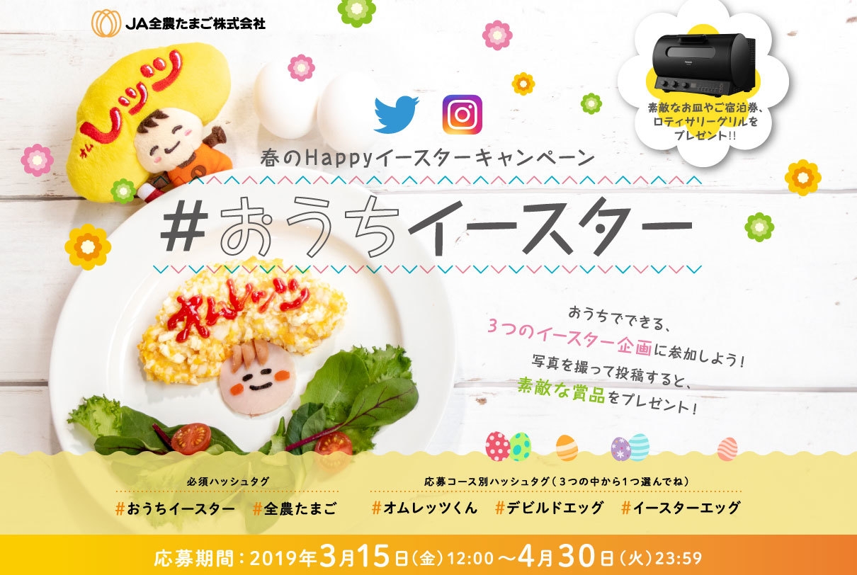 JA全農たまご株式会社(本社:東京都千代田区、代表取締役社長:小島 勝)は、2019年3月15日より、素敵なお皿やご宿泊券、ロティサリーグリルをプレゼントする「春のHAPPYイースターキャンペーン #おうちイースター」を開催いたします。