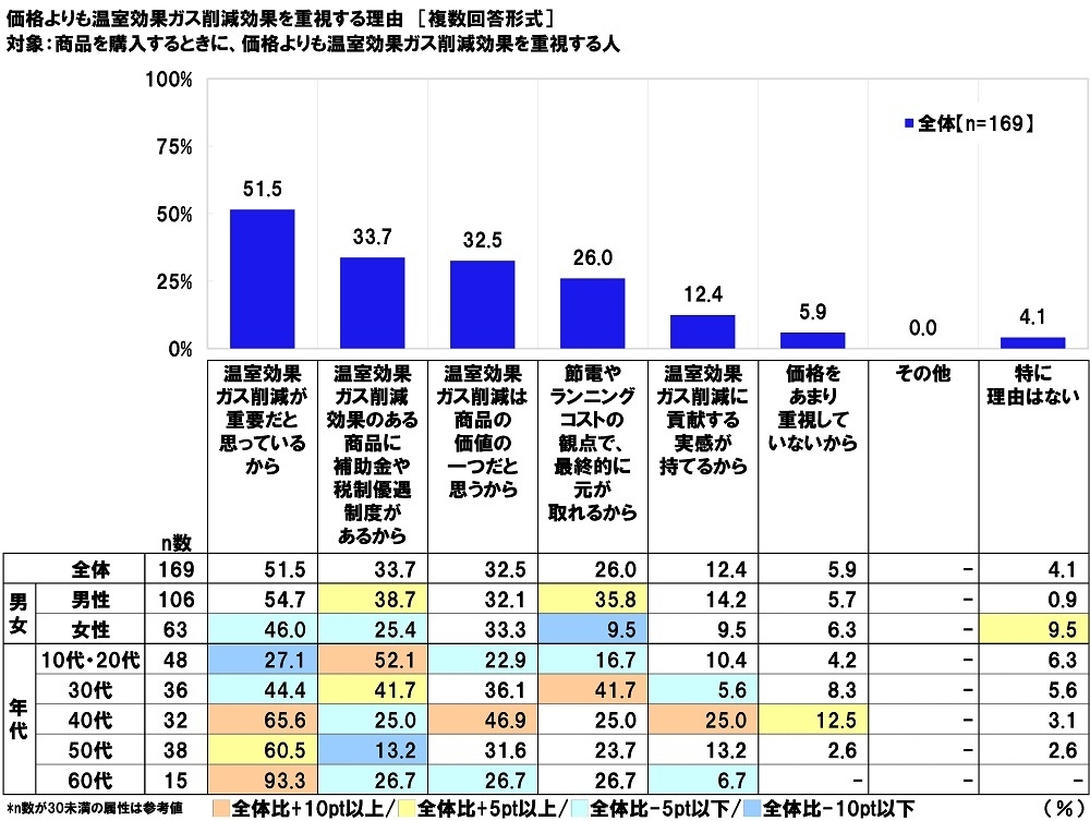商品を購入するときに、価格よりも温室効果ガス削減効果を重視する人(169名)に、価格よりも温室効果ガス削減効果を重視する理由を聞いたところ、「温室効果ガス削減が重要だと思っているから」(51.5%)が最も高くなり、「温室効果ガス削減効果のある商品に補助金や税制優遇制度があるから」(33.7%)が続きました。