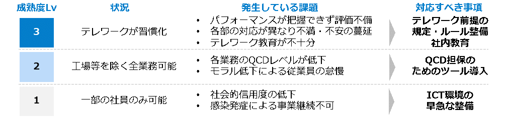 特にテレワーク導入に関しては成熟度レベル診断を行い、現状把握を実施するとともに、「ICT環境」「利用ツール」「規定ルール類」「教育」の観点で体制整備を支援いたします。