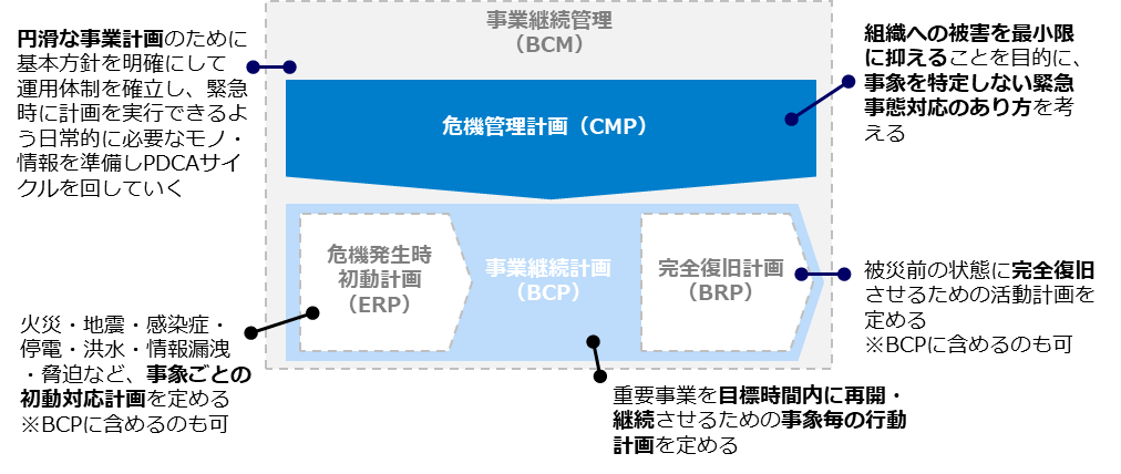 これからは、PDCAサイクルを回し常に最善な体制とするための事業継続管理(BCM)・事象にとらわれず危機発生後の意思決定体制や運用方法を定める危機管理計画(CMP)、初動対応計画(ERP)・完全復旧計画(ERP)を盛り込んだ真の意味で機能する事業継続計画(BCP)の策定が急務となっています。